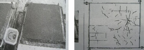 左圖:同一環(huán)境中不同保濕條件下的試件; 右圖:未覆蓋的試件裂縫開展情況(實(shí)測(cè)描繪)