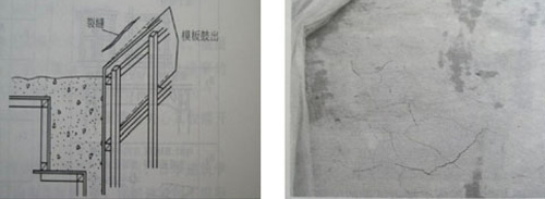 圖-6 模板側(cè)向變化引起的開裂 圖-7 混凝土淺表面的龜裂